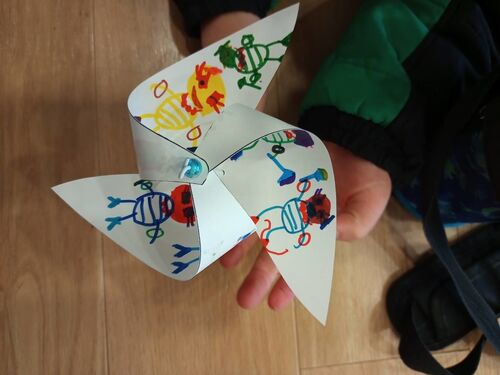 学童デイ・サービス「レ・マーニ」にて 持ち手の部分を直に持ち、身体の動きと一体感のあるかざぐるまで遊びました 持って動くと一緒にまわりまーす 持って走ると高速でまわりまーす!